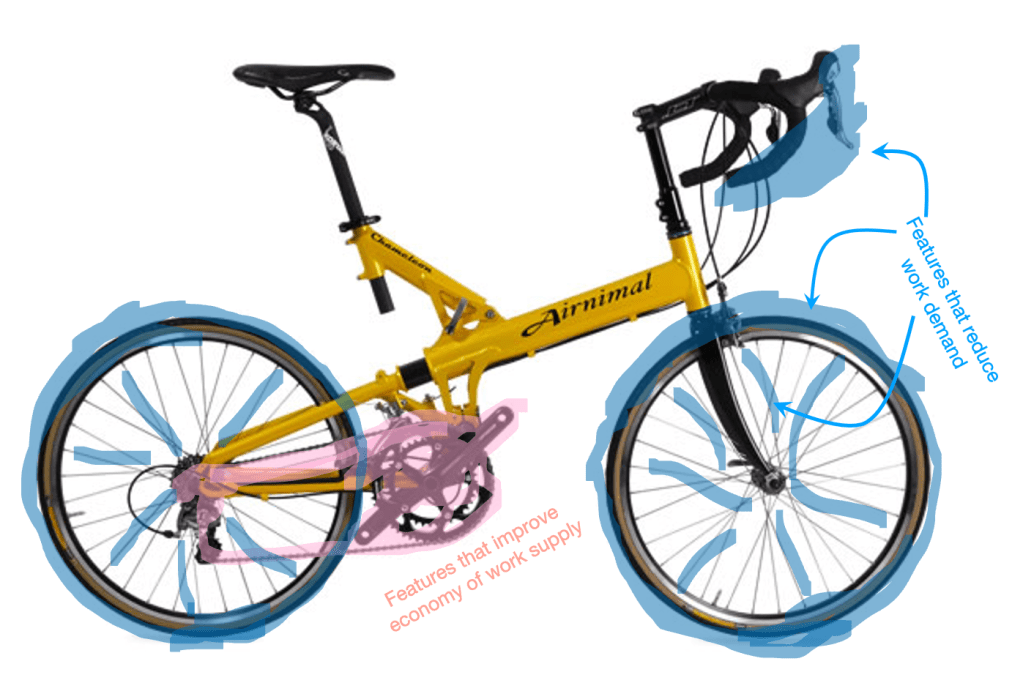Legs can be thought of as vehicles, machines that perform the tasks of supporting body weight as it translates with both low mechanical work demand and economical work supply. Design for these tasks is clear in the case of a bicycle: