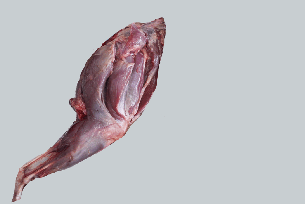 Some anatomy apparent in a skinned fox hindlimb: bf biceps femoris; v vastus; rf rectus femoris; TFL tensor fasciae latae. The four muslces have origins along the pelvis, and insert on to the patella. Fox, dissection and graphic thanks to Richard, George, Delyle, Pete and Alice.