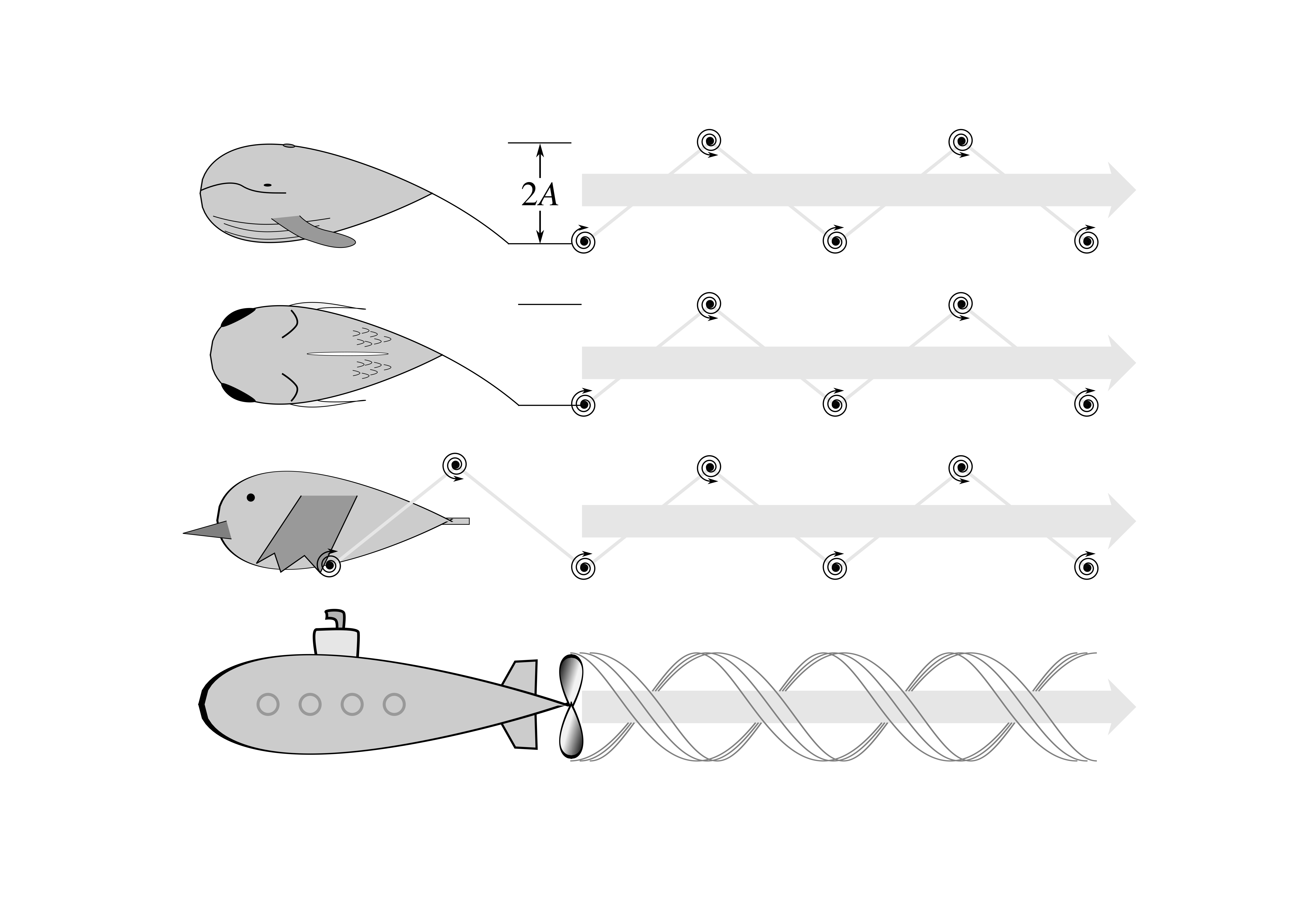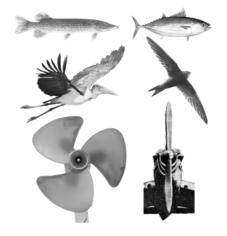 What connects the way fish fins, whale flukes, bird and bat wings, and propellers move to provide thrust? Why do pike have broad tail fins, but tuna have narrow? Why do vultures and pheasants have broad wings with ‘fingered’ wingtips, but swifts have narrow, simple wings? These questions cannot be answered by thinking only about aeroplane wings. However, they can by using simplified propeller theory, with results evident from fan and propeller design: efficient thrust production at low speeds – obvious for the pike, but also vital for loaded or rapid take-off in vultures and pheasants – requires broad, high-lift foils like a desk fan. At high speeds, narrower foils produce thrust efficiently, accounting for tuna, swift and Spitfire propeller design.